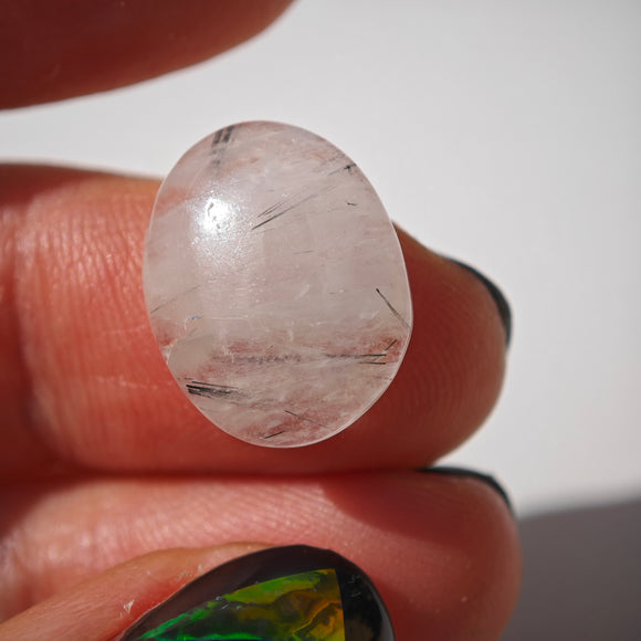 Descubre un bello Cabujón Ovalado de Cuarzo con Rutilo Negro, una pieza diáfana en su forma más elegante y sofisticada. Este cabujón despliega ese fascinante contraste sutil entre blanco cristalino del cuarzo y las delicadas inclusiones negras de rutilo que cruzan la piedra como constelaciones suspendidas en el tiempo.