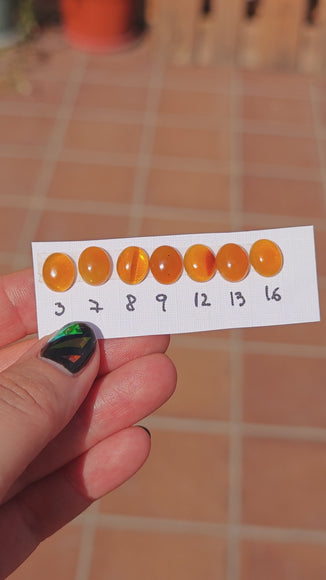 Descubre la esencia ígnea de los atardeceres de Oregón con nuestros Cabujones Ovalados de Ópalo de Fuego, pequeñas cápsulas de luz que capturan el fuego interior de la tierra en su forma más delicada. Cada óvalo pulido despliega ese característico naranja caramelo que parece contener miel líquida solidificada, con una transparencia que difumina la luz como el resplandor de una brasa bajo cenizas. Estas gemas muestran el juego de color único del ópalo de fuego, donde la silicio y el agua se unen para crear profundidad y calidez visual en miniatura.