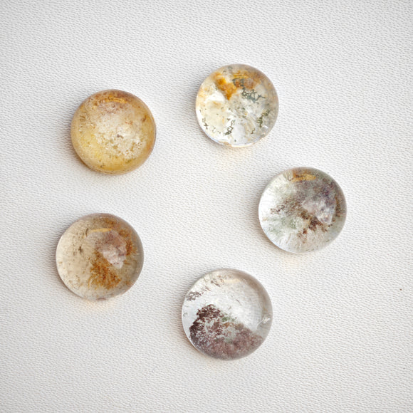 Descubre la belleza en miniatura con nuestros Cabujones Redondos de Lodolita, pequeñas obras maestras de la naturaleza donde cada pieza muestra los característicos patrones "acuarela" de este mineral único.