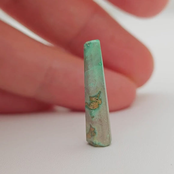 Esta punta alargada triangular despliega ese característico verde manzana suave que parece contener la frescura de los campos zamoranos, con vetas ocres que emergen como pequeñas islas terrosas flotando en un mar de tranquilidad mineral. Cada faceta a lo largo de su estructura ha sido meticulosamente pulida para guiar la energía con precisión, creando un canal de conexión entre la tierra y el espíritu.